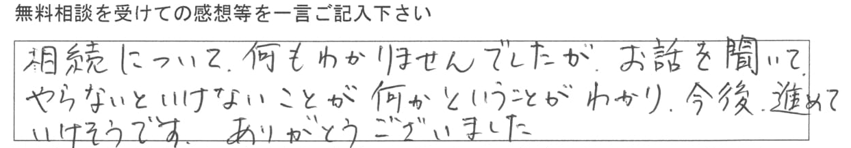相続について、何もわかりませんでしたが、お話を聞いて、やらないといけないことが何かと